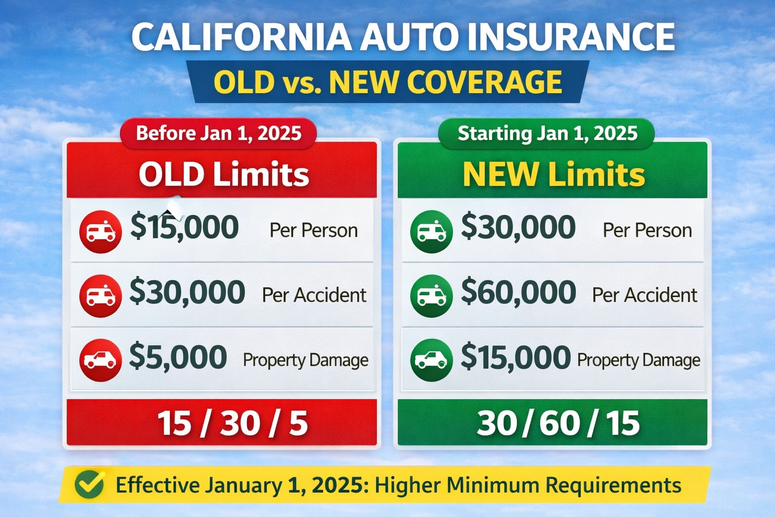 Starting January 1, 2025, California drivers will be required to carry higher auto liability insurance limits for the first time in decades. These changes are designed to better reflect today’s medical costs, vehicle repair expenses, and the financial realities of serious accidents.